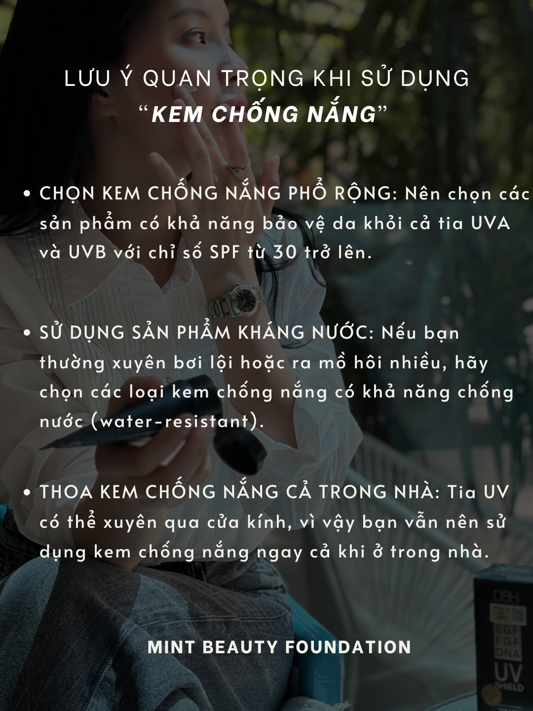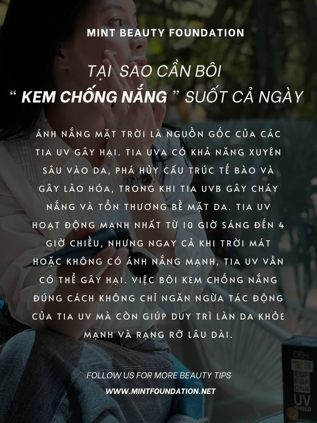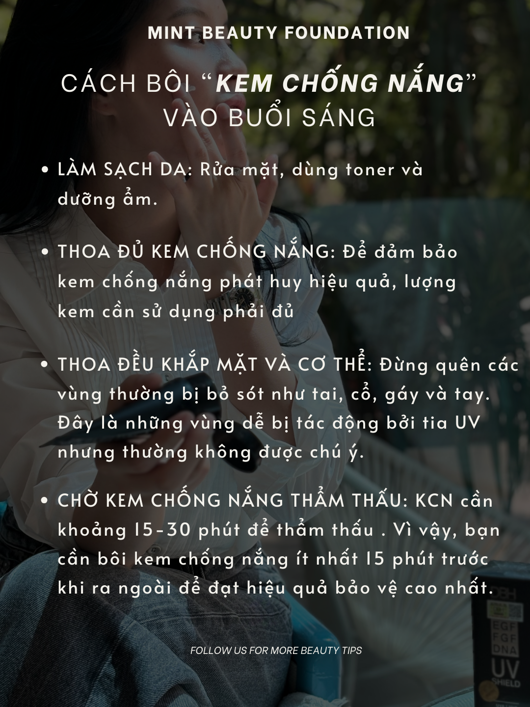 Việc bôi kem chống nắng là một bước không thể thiếu trong chu trình chăm sóc da hàng ngày. Tuy nhiên, để đạt hiệu quả cao nhất, bạn cần thoa đúng cách và duy trì suốt cả ngày. Hãy nhớ rằng, một làn da khỏe mạnh và tươi trẻ là kết quả của việc bảo vệ da khỏi ánh nắng mặt trời. MinT luôn đồng hành cùng bạn trong hành trình chăm sóc và bảo vệ làn da, giúp bạn tỏa sáng với vẻ đẹp tự nhiên, tự tin và rạng rỡ suốt cả ngày.