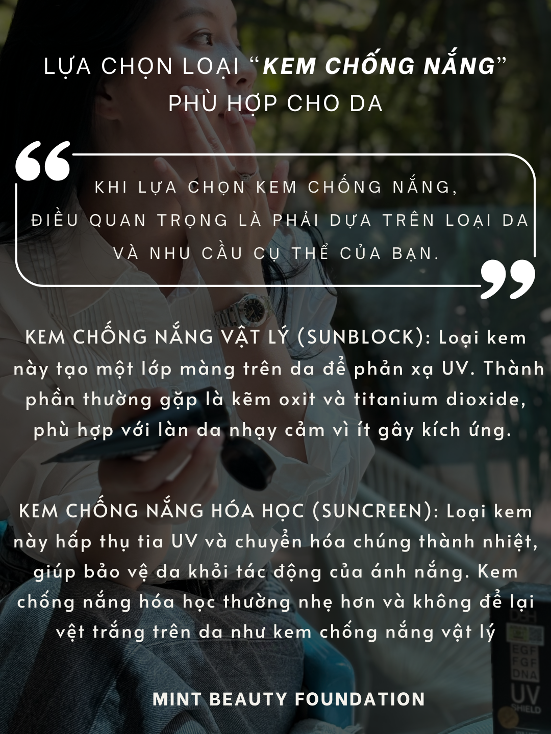 Khi lựa chọn kem chống nắng, điều quan trọng là phải dựa trên loại da và nhu cầu cụ thể của bạn. Dưới đây là hai loại kem chống nắng phổ biến: